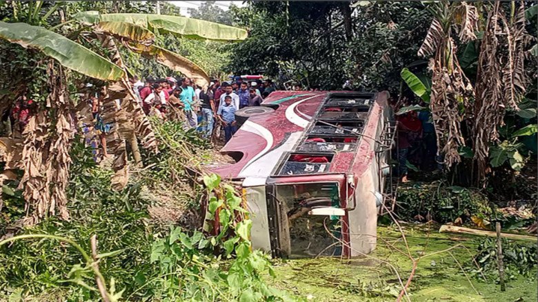 পথচারী নারীকে চাপা দিয়ে বাস পুকুরে, নিহত ১, আহত ১০
